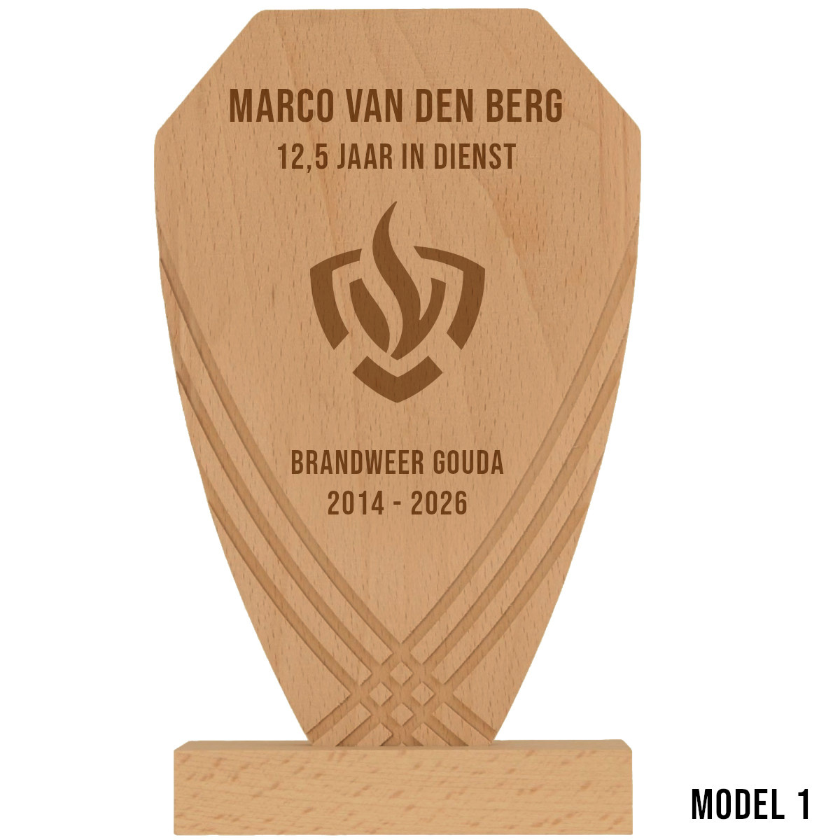 Een indrukwekkende carrière bij de brandweer verdient een tastbaar en eervol eerbetoon. Of een collega nu met pensioen gaat, de post verlaat, of een indrukwekkend jubileum viert; met deze massief houten award geef je een geschenk dat de waardering voor jarenlange inzet perfect overbrengt.