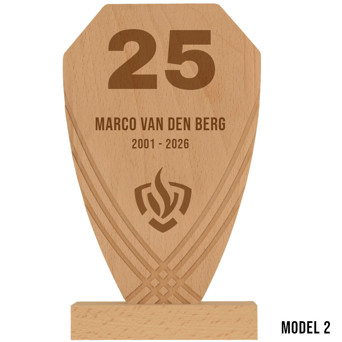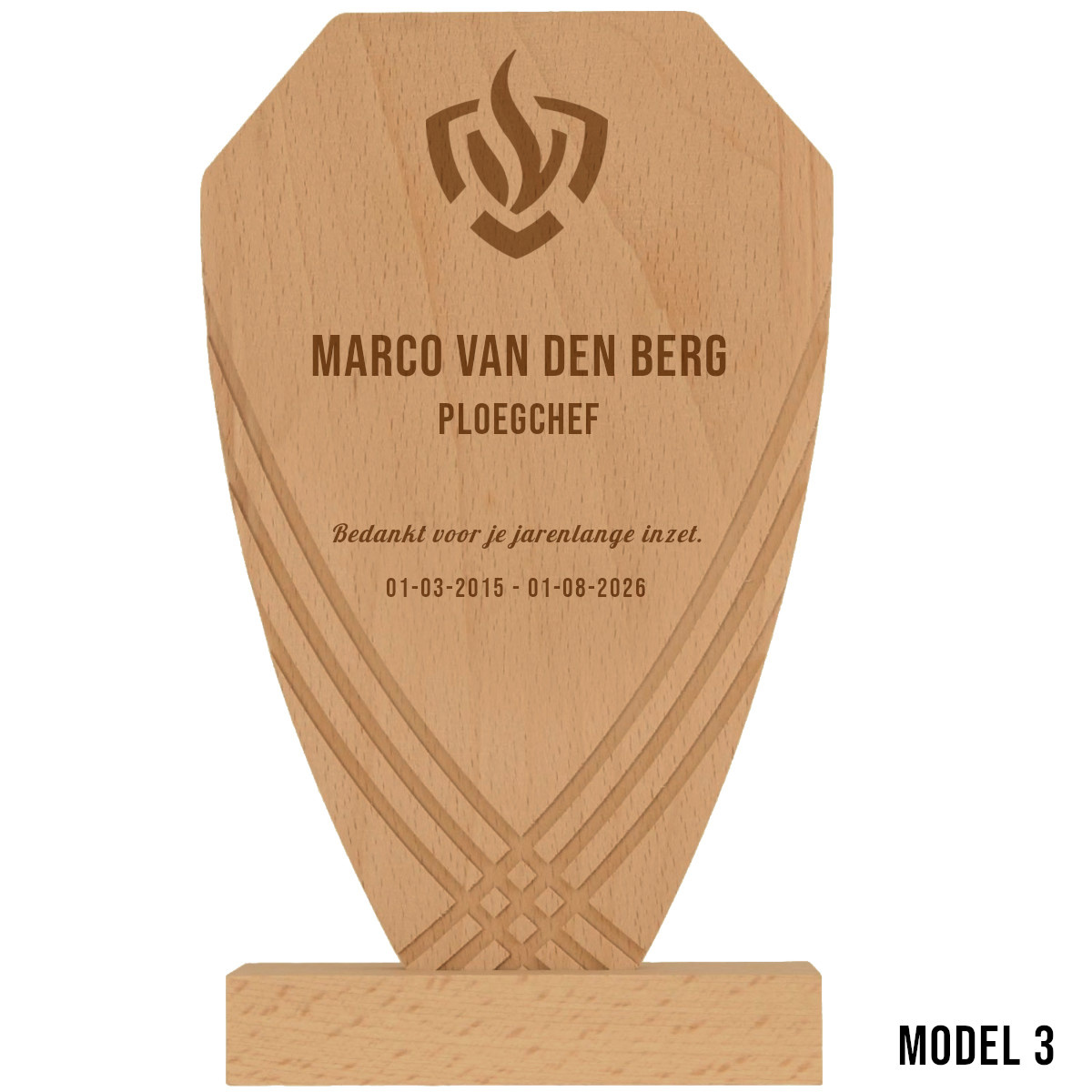 Houten Ereschild – Een stijlvol eerbetoon voor jubilea en afscheid. Dit massief beukenhouten schild op voet is perfect voor een persoonlijke gravure. Een stoer en tijdloos aandenken dat recht doet aan de jarenlange inzet van elke brandweerman of -vrouw.